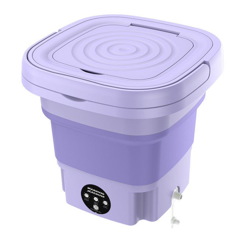 ポータブルでモダンなデザイン: 紫色の折りたたみ式洗濯機。アパート、旅行先、スペースが限られている場所などの狭いスペースに最適です。